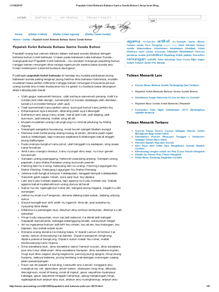 Pepatah orang tua zaman dahulu dalam siloka sunda disebut juga dengan bahasa buhun kolot baheula. Peribahasa sunda lengkap beserta arti dan contohny. Download mp3 bahasa sunda buhun dan video mp4 gratis. 227 ungkapan peribahasa sunda dan artinya sundapedia com. Berandabahasa sunda onlinepepatah hidup dalam peribahasa bahasa sunda dan maknanya. Menururt anis djatisunda, sampai dewasa ini saya belum menemukan pendapat para ahli yang berani memastikan. Pepatah orang tua zaman dahulu dalam bahasa sunda disebut dengan bahasa buhun kolot baheula. Dalam hal tata bahasa, negara barat memiliki proverb, jepang memiliki kotowaza, cina memiliki yanyu, sedangkan indonesia memiliki peribahasa. Kami beri peribahasa dan penjelasan untuk seribuan peribahasa. Namun alangkah lebih baiknya bila kita mencoba mengenal peribahasa warisan leluhur tersebut. 28 november 2014 33,574 views no comment. Pepeling sunda dalam bahasa indonesia artinya adalah nasehat. Kumpulan ungkapan sunda dan peribahasa sunda lengkap dengan artinya.