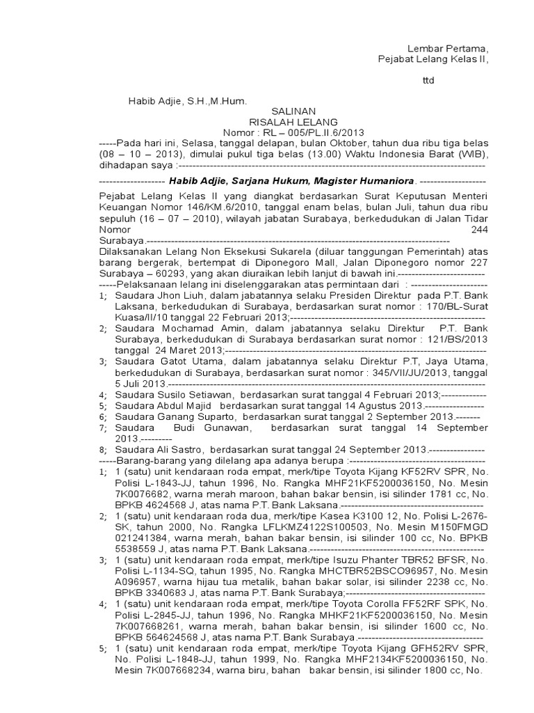 Surat Kuasa Pengambilan Risalah Lelang - Contoh Risalah Lelang / Dan jika anda sudah melunasinya, maka anda bisa mendatangi kantor finance yang membiayai kredit anda.